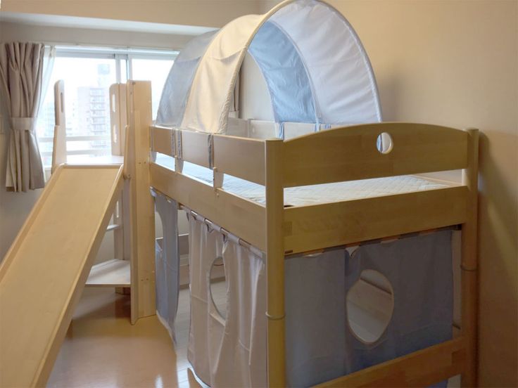 滑り台付きの木製のロフトベッド。ナチュラルベースのお部屋にツリーハウスのテントがピッタリ。