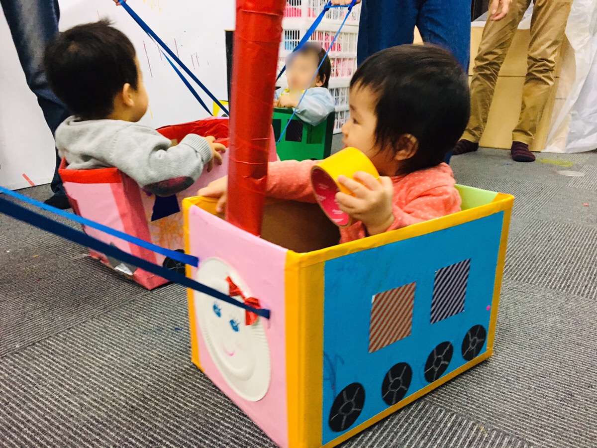 親子で電車ごっこ!ベビークラス ダンボール電車の工作造形大阪の絵画教室・お絵描き教室モネスク。