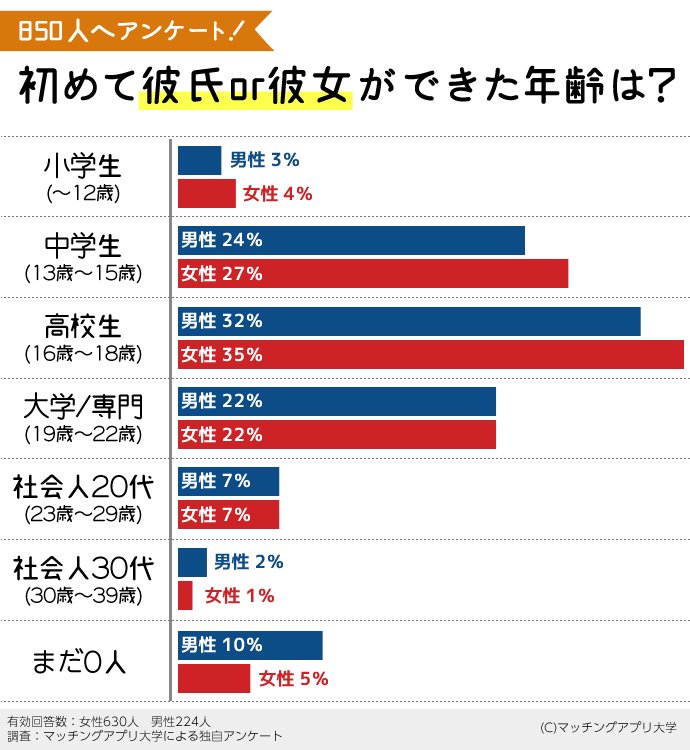 公式 マッチングアプリ大学 on X: " みんなの恋愛白書今回は「初めて彼氏or彼女ができた年齢」についてリサーチしました!一番多かったのは男女とも「高校生」という結果でした。意外にも社会人になってから恋人ができたという人は少ないようです。 恋人いない歴。