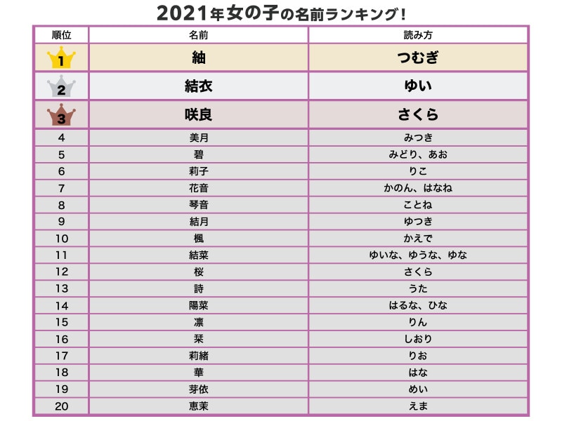 女の子の名前ランキング人気TOP100 2021年最新版赤ちゃんの命名・名づけAll About。