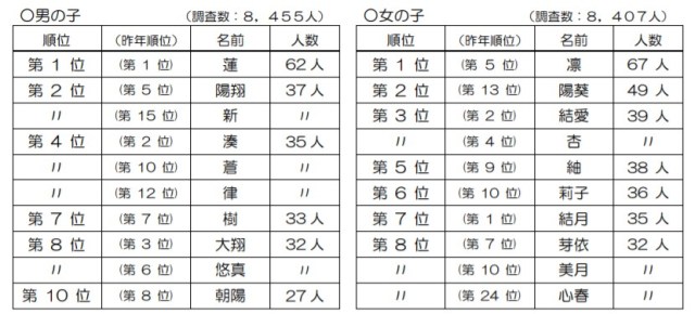 赤ちゃんの名前 2025年人気の漢字一文字の名前ランキング、女の子は「凛ちゃん」が1位に - 男の子は?2025年8月25日-エキサイトニュース。