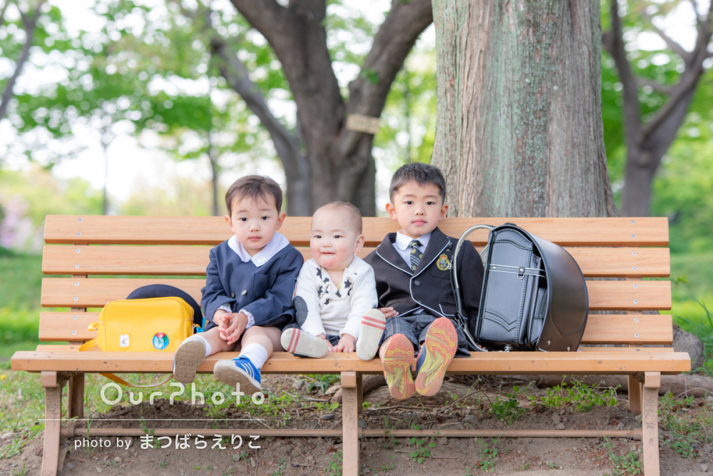 ランドセルを背負ったお兄ちゃんと制服姿が可愛い弟くんの家族写真の撮影OurPhoto アワーフォト。