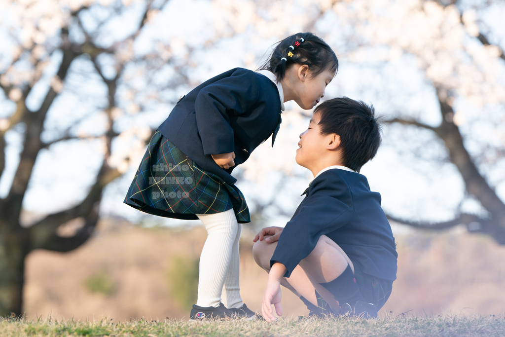 兄弟フォト制服フォト ランドセルフォトラスト投稿📸 桜が綺麗なスポットに移動して撮影しました🌸 のりのりで写ってくれて楽しかったな〜いい思い出を作れました! 来週には小学生✨✨ ファイト! たぶん、この兄妹‥‥ 仲良しです。