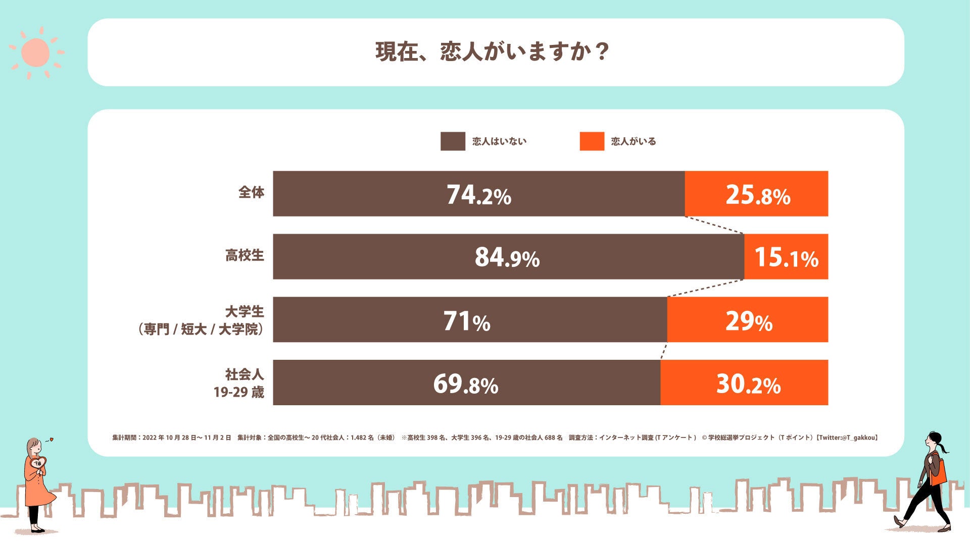 学校総選挙プロジェクト 10代~20代若者の交際未経験率は36.4%。23歳以下の女性では、「恋人・恋愛」よりも「推し活」を優先カルチュア・コンビニエンス・クラブ株式会社のプレスリリース。